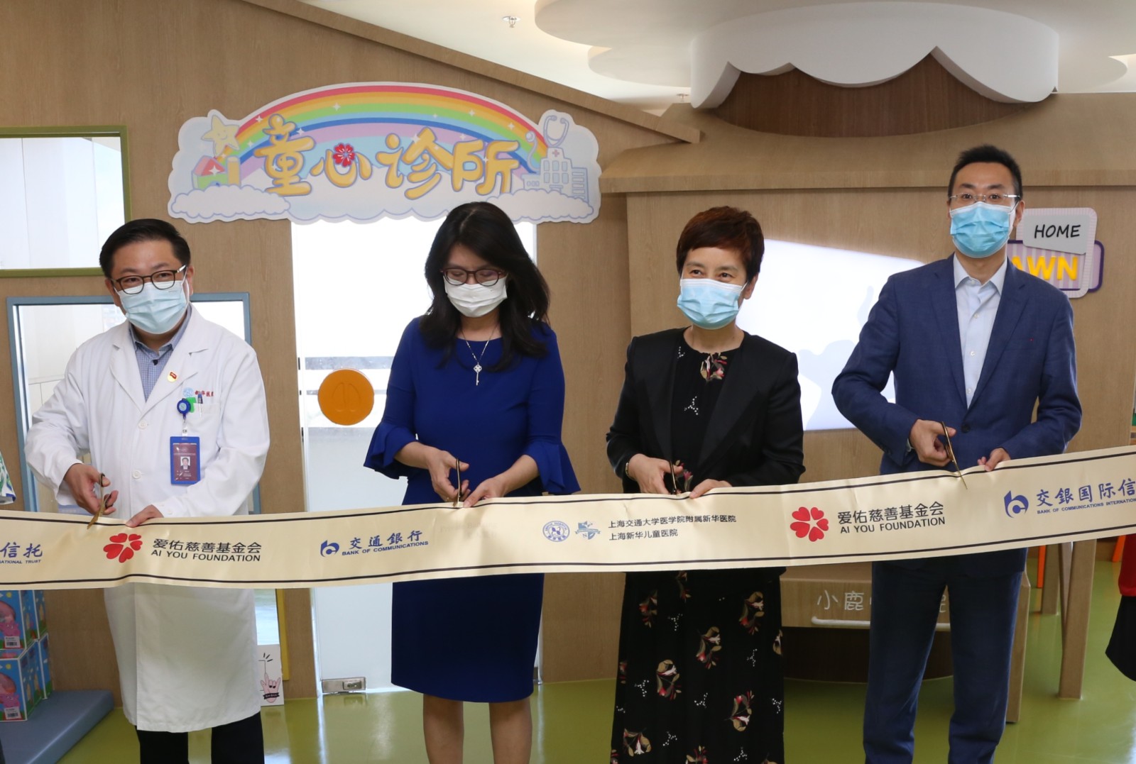 上海交通大学医学院附属新华医院党委副书记赵列宾、交通银行私人银行部总裁梅津芝、交银国际信托有限公司副总裁陈维和爱佑慈善基金会理事长耿源共同为“爱佑·交银国信童乐园”启动剪彩